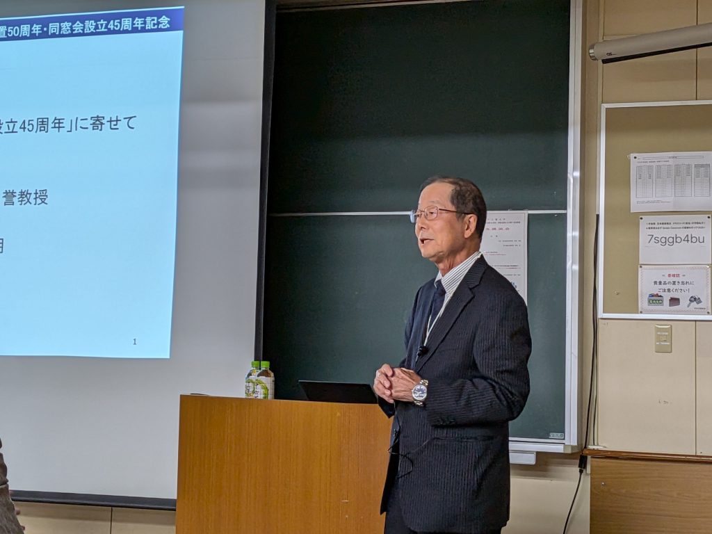 記念講演会は、令和7年10月11日(土) 14時から、八戸工業大学2-204教室にて、長谷川明氏(八戸工業大学元学長)が「学科設置50周年、同窓会設立45周年に寄せて」と題し、堀合紳弥氏(東北大学助教、令和5卒)が「多様な地域人口・道路ネットワークに対応していくための津波避難最適化アプローチ」と題した、ご講演をいただき、同窓生、在学生、現旧教職員など約90名が聴講し、盛況のうちに終了いたしました。
